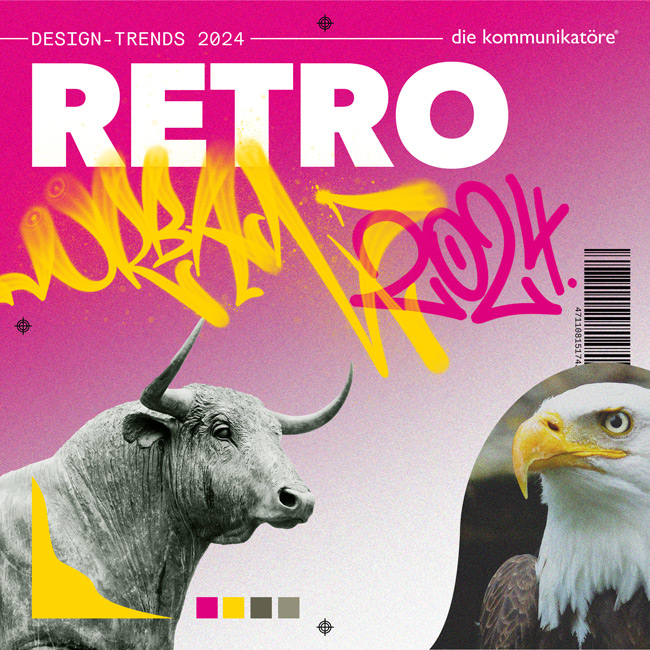 Graffiti-Elemente und Grotesk-Schriften, experimentelle Farbkleckse, klare Barcodes, Schnittmarken, Passermarken und Farbfelder, markante Linien, die abtrennen – Trend ist, was stört. Pixelschrift, vereinzelte 3D-Buchstaben, abgerundete Störer. Künstlerische und sogar verstörende KI-generierte Bilder – am besten freigestellt und mit starkem Rauschen oder Farbverläufen.